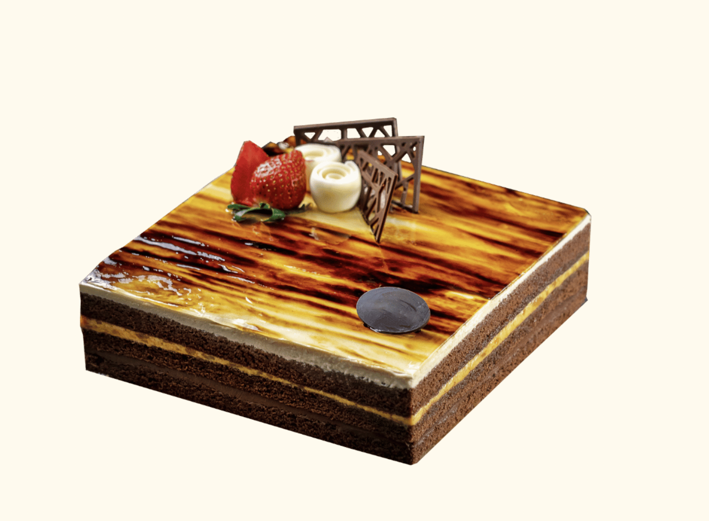 What’s not to like about the delightful pairing of chocolate and caramel. This chocolate sponge cake is layered with caramel cream and chocolate ganache. C’est magnifique!