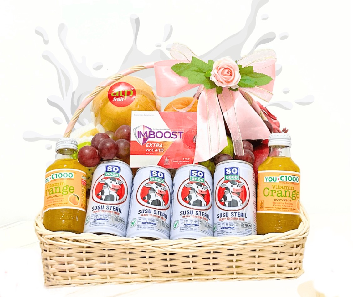 A thoughtfully curated fruit hamper, perfect for celebrating birthdays or brightening your loved ones on their road to recovery. It features 10 premium fruits—Singo pear, dragon fruit, grapes, Sunkist, Wokam, a trio of sweet pears (Century, Pakcham, Xianglie), and crisp Fuji & red apples—paired with nourishing drinks like milk and You C 1000, as well as Imboost (4 tablets) to support the immune system.
