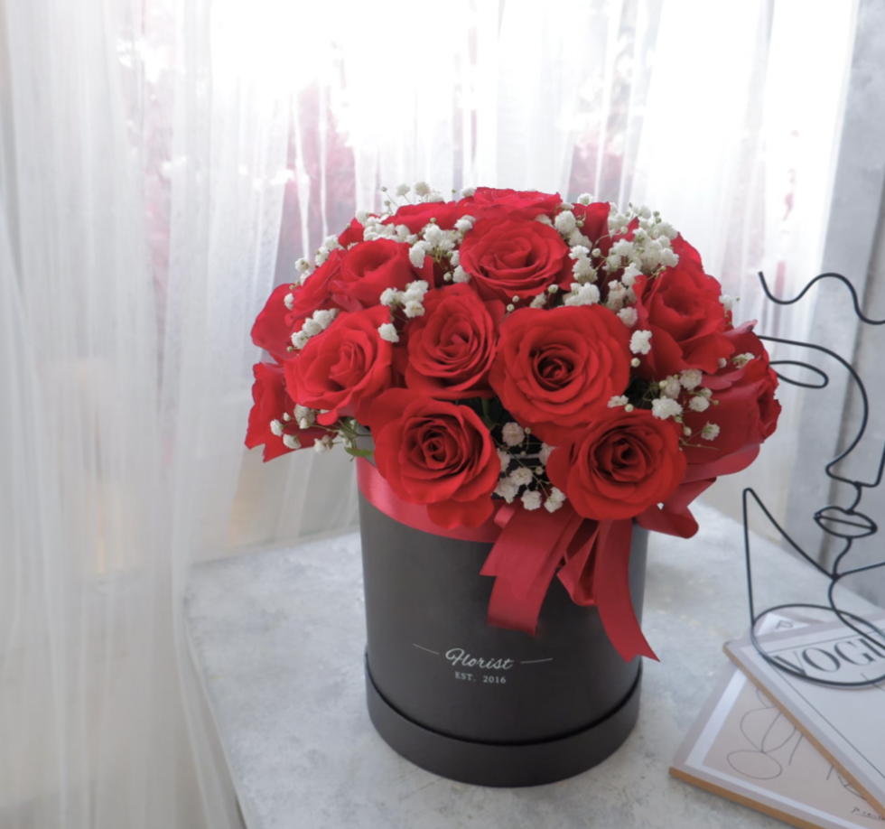 20 red tall roses in an elegant round black box to enchant someone’s special.