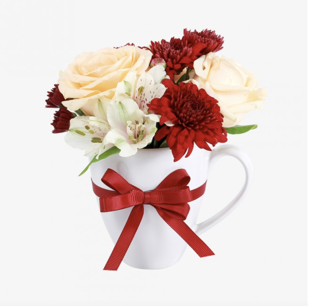 Mini mug of flowers and packed with lots of love. It includes roses, peruvian lily and aster.