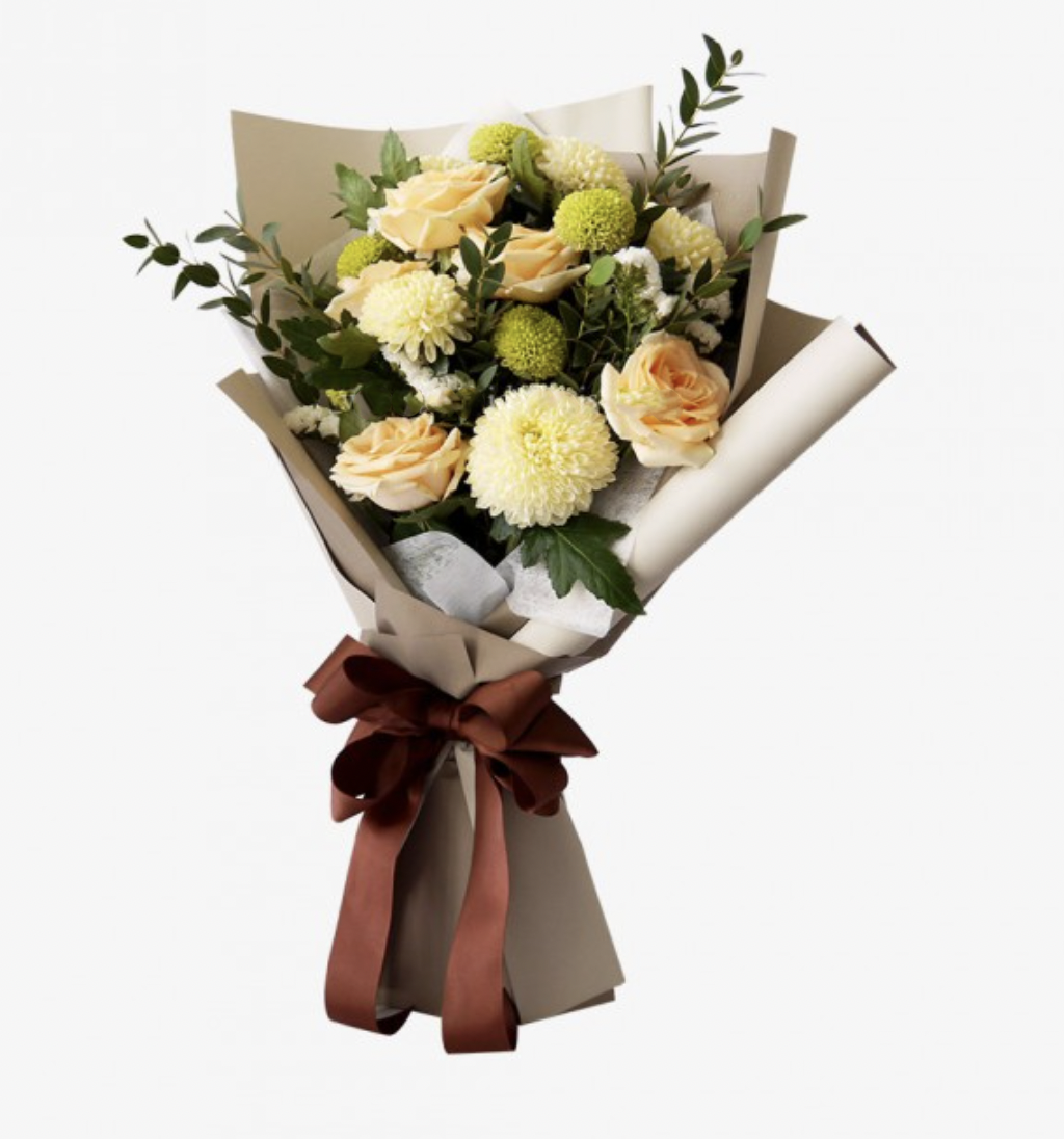 This bouquet will transfer all the warm feelings in the world to your loved one. It includes roses, gompie, poms, dan parvifolia.